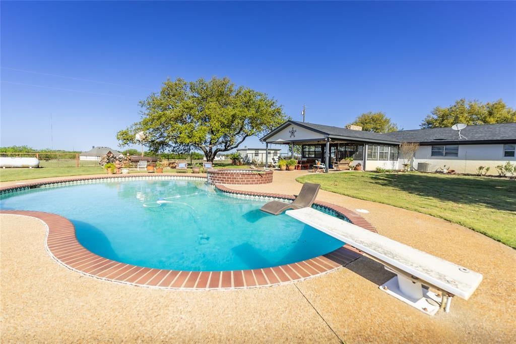 This beautifully updated 2,744 square ft, 3-bedroom, 2.5-bath ranch-style home offers everything you've been looking for! Enjoy new lighting, fresh paint throughout, and a brand-new ensuite in the primary bedroom. The home is filled with natural light and features a charming brick fireplace, a game room, and a combined family and dining room with an open feel. Step out from the game room onto the covered patio, which leads to a fantastic backyard oasis. You'll find an in-ground pool with a diving board and spa, surrounded by mature trees providing ample shade – perfect for barbecues and entertaining. The property also includes a 2-car garage, an asphalt driveway, and sits on 2.365 acres dotted with beautiful oak trees. There are also sheds and covered outbuildings ideal for equipment, horses or 4-H projects, along with enclosed areas for feed and hay storage or a workshop. Located in the highly regarded Peaster ISD, this home offers a peaceful country setting while being just 10 minutes from the town of Weatherford and IH20. Please inquire with the listing agent to schedule a showing & instructions... Seller requires 24 hrs notice. Note: Additional acreage could be available.