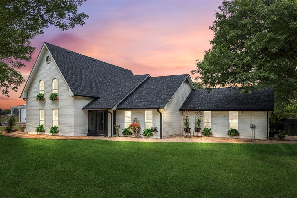 Discover this beautifully updated farmhouse style home nestled in the peaceful countryside. Meticulously maintained, this spacious residence features 4 bedrooms, 2 and a half bathrooms, with a stunning nail-down hardwood floors throughout the main level. The kitchen is a chef's dream, highlighted by white cabinetry, an oversized quartz island, a gas cooktop, and double ovens. A bay window floods the home with natural light and offers scenic views of the property. The inviting living area boasts a large brick fireplace, custom built ins, and panoramic widows overlooking the sparkling pool and expansive patio, perfect for indoor outdoor living. Retreat to the oversized primary suite, which includes a luxurious en suite bath complete with his and hers vanities, a garden tub, and a beautifully tiled walk in shower. A spacious laundry room provides ample storage and counter space. The dining room is a great flex space with the double french doors. It is versatile and can be a dining room, home office or sitting room. Upstairs you'll find two generously sized bedrooms with walk in closets and a fully remodeled bedroom. Step outside into your private backyard oasis, featuring a large covered patio for entertaining, a separate gazebo and a dedicated grilling area. Two outbuildings enhance the property: one is an ideal office or recreational space with heat and air (approximately 720 sqft) and the other is a fully insulated workshop (approximately 2400 sqft) with oversized garage doors, easily able to store a boat or RV. The workshop is perfect for hobbies or storage. Additional features include two carports, ample parking and secure entry with two wrought iron gates. The entire property is fully fence for privacy and peace of mind.