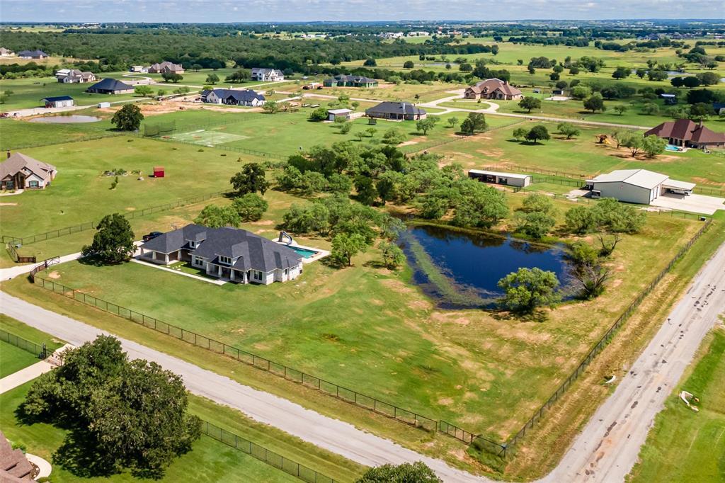 GORGEOUS CUSTOM HOME IN BROCK ISD WITH NO CITY TAXES & NO HOA on almost 4 acres with a pool and a pond! This is the perfect home for those that want some extra space, and outdoor amenities for the kids to enjoy! Beautiful open floor plan with a large family room with a fireplace, and a huge kitchen with tons of cabinets (with pullouts) and countertop space! Eye catching quartz countertops with stainless appliances! Wonderful split bedroom arrangement with a sizeable master overlooking the large salt water pool! Pristine master bath with walk in shower from both sides! The home features its own private pond, 2 dishwashers, an extra washer-dryer for the jack & jill baths, drying racks in the utility room, fiber internet, a second front entrance and mud room, and a large storge closet for Christmas decor or other items. There is a storage garage, and the 3 car carport could easily be enclosed. Good blown in and radiant barrier insulation. ABSOLUTELY GORGEOUS!