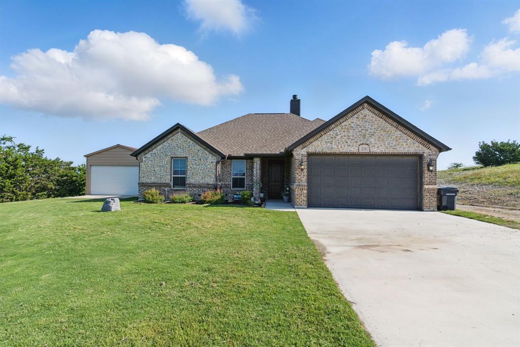 NO HOA! New PRICE!! Sellers are ready to work with buyers who have been dreaming of Texas sunsets on peaceful acreage. Offering a charming 3-bedroom, 2-bath residence with 1,710 sq ft of well-designed living space - featuring a desirable split floor plan. The open-concept living area boasts a vaulted ceiling with an exposed beam and a striking stone and brick wood-burning fireplace - perfect for cozy evenings at home. Enjoy the perfect blend of style with custom cabinets, tile and carpet flooring throughout, and spacious primary suite with an ensuite bathroom. Step outside to relax on the covered patio where you can take in the breathtaking views of rolling hills and stunning sunsets on your 1.43 acre lot. For those who enjoy to work or play, a 20x30 spray foam insulated shop provides the ideal space for projects, hobbies, or storage. Plus, peace of mind comes easy with a powerful Generac 22k generator connected to a dedicated liquid propane tank. This home is the perfect mix of comfort, practicality, and country charm - all waiting for you.