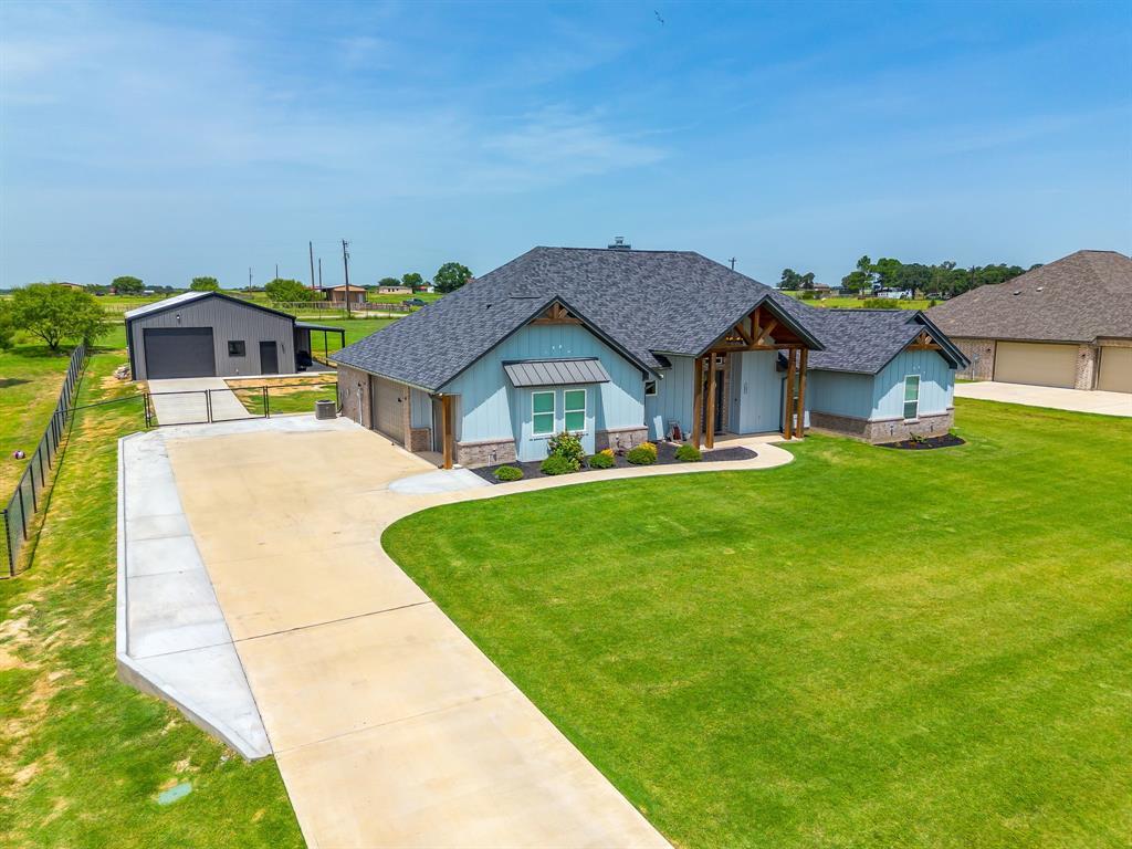 FANTASTIC farmhouse-style home on a 1-acre lot in a quiet, well-kept neighborhood just minutes from Brock ISD top-rated schools. MAJOR improvements such as a shop, additional dwelling unit, fencing and additional concrete! Inside, you'll find a warm and inviting layout with plenty of natural light and a cozy farmhouse feel that makes you feel right at home. The living room has vaulted ceilings, a wood burning fireplace with a gas starter option. It is open to the spacious kitchen with features including custom cabinetry to the ceiling, color splashed accents, quartz countertops with designer backsplash and a large kitchen island with room for barstools. Enjoy a split floorplan between the primary bedroom, secondary rooms and 5th bedroom, which could be a game room, playroom or creative flex space. Two of the secondary bedrooms share a jack and jill bathroom with their own vanity. When you step outside, a 30x50 fully insulated shop comes complete with its own living quarters, including a bedroom, bathroom and space for kitchenette—perfect for guests, home business, or ultimate hobby space. Bedroom and bathroom is currently being finished and will be prior to closing. Extra poured concrete gives you tons of room for parking. The entire backyard is fully fenced and plenty of space for a pool or outdoor play area. Whether you’re looking for space to spread out, room to work from home, or a place to enjoy country living with convenience, this property has it all! Schedule a showing now!