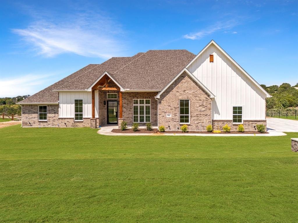 Located in a gated community, this custom designed 4 bedroom, 3 bath home offers the perfect blend of modern farmhouse charm and luxury finishes. Set on 2 acres in highly sought after Brock ISD. The open concept layout features soaring ceilings, wood beam accents, and an abundance of natural light. The living area boasts a striking floor to ceiling fireplace wall with built-ins, flowing seamlessly into the gourmet kitchen with an oversized island, pot filler, walk-in pantry, and custom cabinetry. The dining area showcasing panoramic views of the expansive backyard and opens to a covered patio with an outdoor kitchen ideal for entertaining. Retreat to the private primary suite with a spa inspired bath featuring a freestanding tub, walk-in shower, dual vanities, and a massive custom closet. Additional bedrooms are generously sized, with designer baths and a split floor plan offering privacy for guests. A mudroom, oversized laundry with built-ins, and 3-car garage adding functionality to the luxury. Enjoy peaceful country living with modern amenities, all within minutes of schools, shopping, and dining.